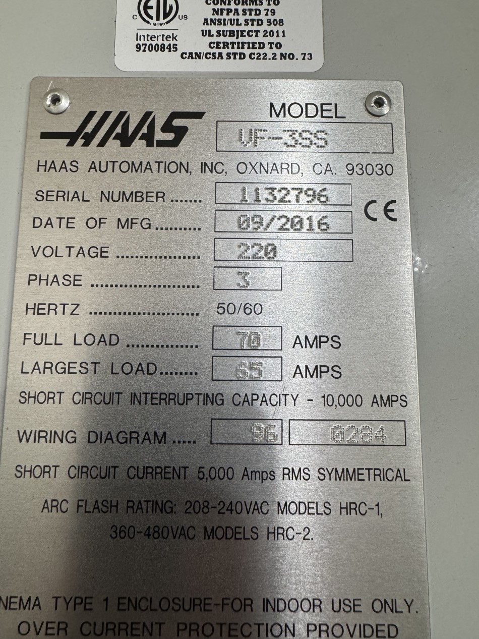 HAAS VF-3SS VERTICAL MACHINING CENTER - BUILT: 9-2016